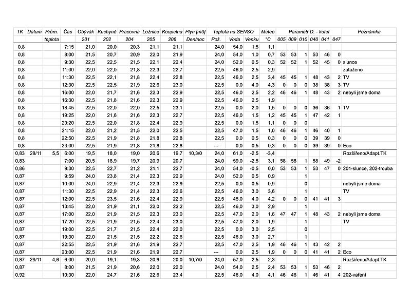 Cihlový, plně podsklepený dům z roku 1960, nezateplený, ale vyměněná okna (eurookna, dvojsklo), nezateplená půda. Obytná plocha: přízemí 66 m2 + patro 66 m2 – propojena otevřeným schodištěm, bytové jednotky nelze oddělit. Objem otopné soustavy 420l. Radiátory litinové, pouze v koupelnách a 1 obývacím pokoji plechové. Termohlavice pouze na plechových tělesech + na jednom litinovém tělese v ložnici v patře. Ostatní tělesa mají staré kohouty (O-Z) Přízemí se nyní neobývá, ale vytápí. Regulace je nainstalována v patře v obýváku s 2 plechovými topeními, hlavice jsou plně otevřené V dolní koupelně hlavice zavřená, v horní koupelně hlavice nastavená na 3, v ložnici hlavice nastavená na 3. Křivka 1.1 požadovaná pokojová teplota den 22°C, noc 17°C, režim připojení pokojové teploty: připojený, režim Auto vyp je Noční tep. Zde jsou prosím dotazy: